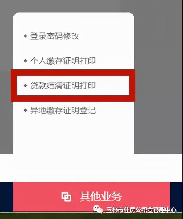 申请人使用电脑登录玉林市住房公积金管理中心个人网上业务大厅(办理网址:https://zfgjjwt.yulin.gov.cn/ish),选择个人网上业务大厅,输入身份证号码、手机号码、登录密码、验证码成功登录后,选择“其他业务”—“贷款结清证明打印”,核实“已结清的贷款合同编号”、“身份证号码”等信息无误后点击“打印”即可。