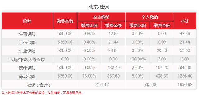 以2021年9月份的北京本市城镇社保,最低缴纳基数5360元来计算,社保费用是1996.92元,其中公司部分需要缴纳的费用共1431.12元,职工个人部分需缴纳565.80元。