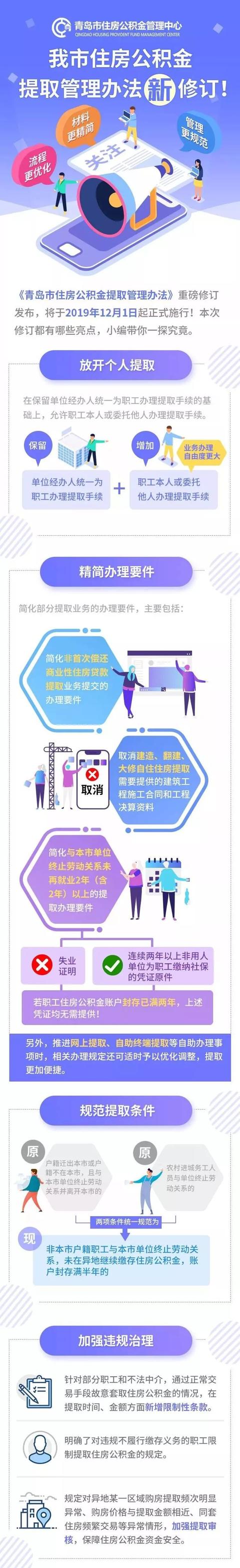 为进一步增强便民成效、强化业务管理,市住房公积金管理中心修订的《青岛市住房公积金提取管理办法》将于2019年12月1日起正式施行。