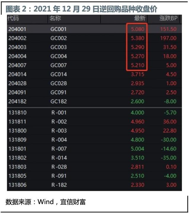 通常每逢年末、季末或重大长节假日前,市场资金相对紧张,手上持有较多国债的金融机构即会以相对平日更高的利率,将所持国债作为抵押物来向市场借钱。以2021年12月29日为例,沪市1天期、2天期、3天期、4天期、7天期逆回购利率均在5%以上,深市多个短期逆回购品种的回购利率也在盘中冲破5%,尾盘期间有所回落,但总体在5%附近。
