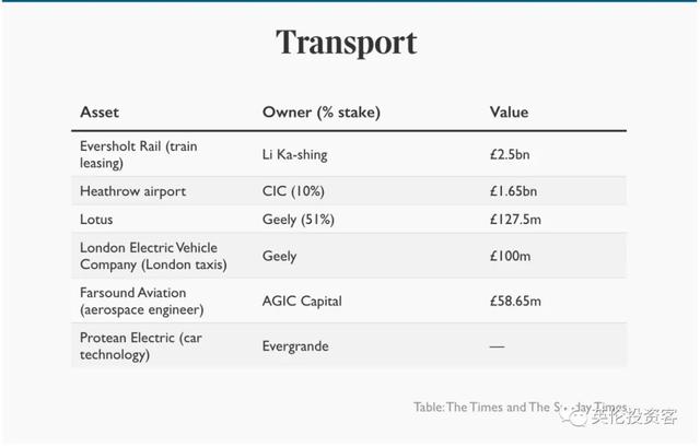 交通行业方面,中国大陆和香港的投资者现在都持有英国关键基础设施企业的股份,如泰晤士水务(Thames Water)、伦敦希思罗机场(Heathrow airport)和英国电力网络等。