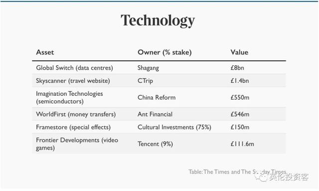 科技方面,江苏沙钢全资收购了英国数据中心运营商Global Switch、携程收购英国订票网站Skyscanner、中国国新控股买下了英国芯片公司Imagination、蚂蚁金服收购了跨境支付公司WorldFirst、北京文投控股买下了英国动画和视觉效果公司Framestore、腾讯收购Frontier等游戏公司。