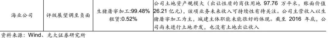 铁岭新城、园投公司、海业公司由于土地出让、商业地产开发未实现收入导致评级调整。铁岭新城由于在2015年和2016年两年商住用地开发和土地出让方面均未实现收入,2015年主体评级调整为负面,2016年则下调1个级别。园投公司2016年在建工程基本停滞未实现工程建设收入,公司有储备地700亩,分别为工业用地300亩、商业用地400亩,但在土地开发和出让方面2016年亦未实现收入,致使评级下调1个级别。海业公司有商住用地97.76万平米,截至2016年底,公司尚未进行土地开发,没有实现土地出让收入,主营收入以生猪屠宰加工为主,城建主体职能未能很好的体现,因此评级展望被调至负面。