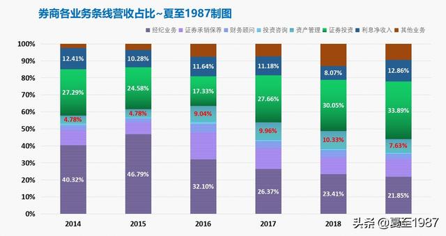 占比在2017-2018年达到峰值时也才10%,现在处在一个萎缩的阶段,到2019年末时只有7.63%了,远远不及经纪、投行、自营投资、信用中介等业务的收入。