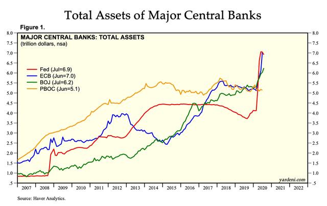 今年以来为应对疫情支出以及经济停滞时维持债务泡沫不崩溃,各国央行第一时间执行激进的货币政策。下面这图是今年以来各主要经济体央行资产数,即M1。可以看到,除中国外,美国欧洲日本都是迅猛增长,尤其是美国。