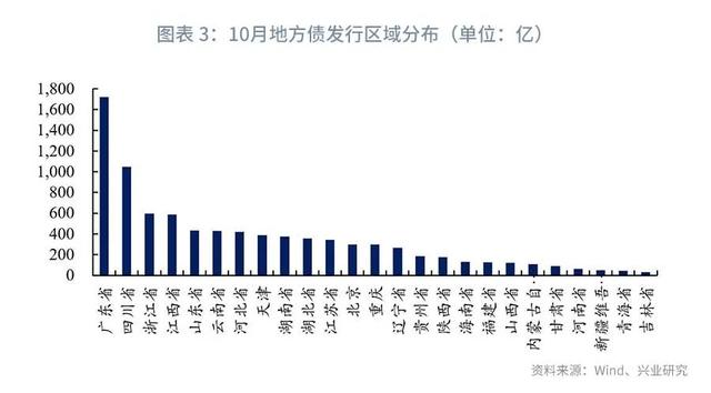 1-10月来看,全国共有31个地区发行地方债,发行规模位居前3的省份分别是广东、山东、四川,分别发行5,822、5,254、3,417亿。