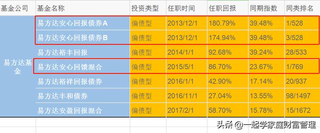 易方达作为国内规模排名靠前的大基金公司,确实拥有很强的投研团队,特别是在固定收益领域拥有很强的实力,不仅产品类型多,并且整体收益很优秀。同时在主动偏股型产品上,也有投资风格坚定且经验丰富的基金经理,值得我们信任。此外受篇幅限制还有很多易方达的优秀基金经理没法详述。