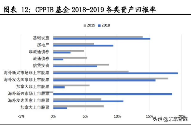 与其他机构不同,非上市股票是 CPPIB 投资组合中主要的收益来源。在增配权 益资产过程中,具有高回报、系统性风险相对较弱特征的非上市股票投资成为了 CPPIB 的配置重点。2004-2019 财年间, CPPIB 对上市股票持仓由 42.7%下降到 33.2%,但对非上市股票持仓却由 2.5%上升到 23.7%,权益资产总持仓也由 45.2% 上升到 56.9%。而 CPPIB 在海外市场配置的非上市股票收益率也高于上市股票:2019 年 CPPIB 在加拿大/海外发达国家/新兴市场的非上市股票投资收益率分别为 5.7%/18.0%/11.8%,而 CPPIB 在加拿大/海外发达国家/新兴市场的上市股票投资 收益率分别为 7.9%/7.5%/-1.7%,非公开发行的权益资产已逐步成为 CPPIB 投资 组合中的主要收益来源。