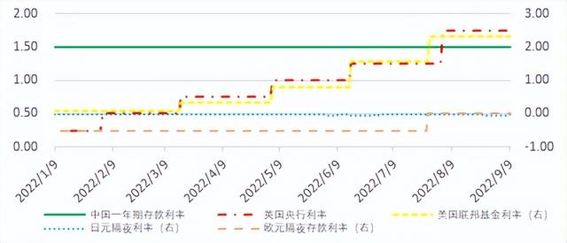 本周,跟踪数据显示,主要国家货币政策利率较上周不变,具体,9月9日,美联邦基金利率为2.32%,联邦基金目标利率(FDTR)为2.5%,欧元隔夜存款利率为0%,日本央行基准利率为负,仍在定量宽松货币政策中,特级警报;英国央行利率为1.75%,一级警报;中国一年期存款利率为1.50%,利率保持稳定,属于相对正常范围。