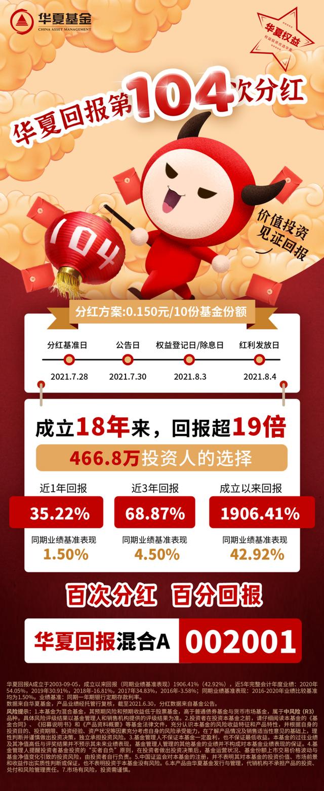 华夏基金今日发布公告:华夏回报混合将于2021年8月3日每十份分红0.15元。8月2日15点前申购或8月3日当天赎回的基金份额,均能享受本次分红。投资者可选择现金分红,落袋为安;或选择红利再投,谋求更高的投资回报。