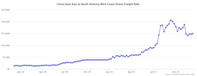 2.海运费用大幅上涨(数据来源于Freightos Baltic Index(FBX))