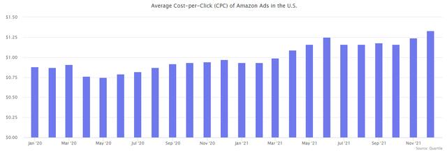 亚马逊2021 年广告的平均每次点击成本 (CPC) 为 1.13 美元,到 2021 年底,亚马逊广告的每次点击价格达到 1.33 美元,而 2020 年为 0.85 美元。比年初的 0.93 美元上涨 43%,比 2020 年同比上涨 37% 以上。