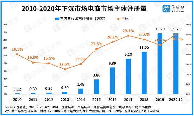 我们将注意力集中在下沉市场,企查查数据显示,过去十年,下沉市场电商主体的年新增注册量从两千多家增长为15万家;从占比来看,2010-2014年下沉市场电商主体占比低于20%;2015-2020年,下沉市场电商主体占比逐渐提高,达到30%左右。