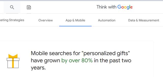 不过通过谷歌移动端的一则数据显示,“personalized gifts”通过移动端搜索的频率在过去两年中增长了 80%以上。
