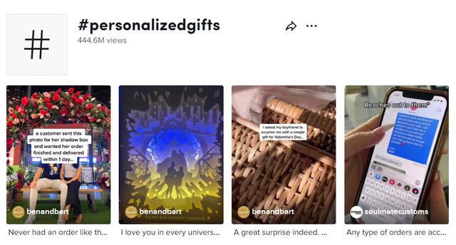在 TikTok 上,光 #personalizedgifts 话题标签的播放量就达到惊人的4.45亿次,其中播放量最大的是一则来自母亲节的礼物视频。