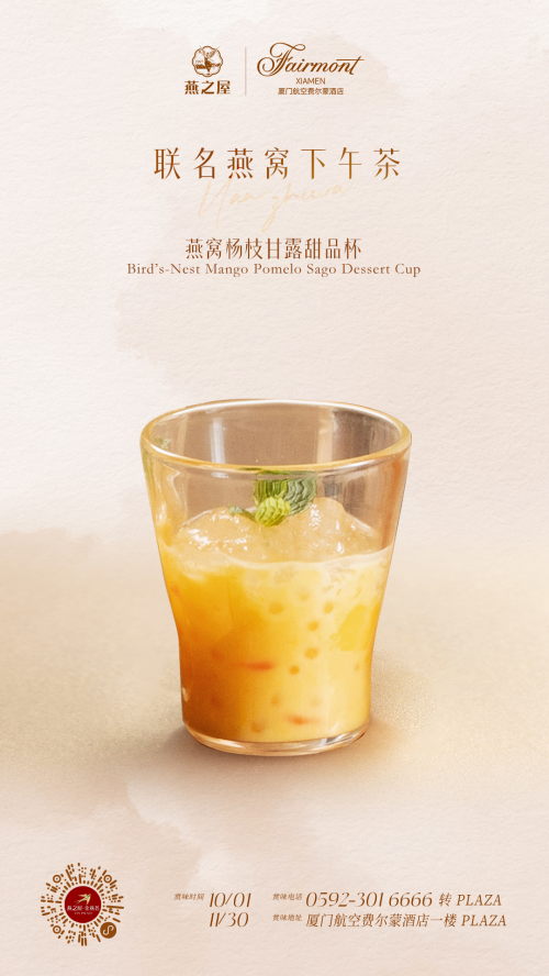 燕之屋与厦门费尔蒙酒店联名燕窝下午茶,将燕窝的温润滋养融入精致茶点,呈献一席秋日滋养之作。这场东方雅宴于2025年10月1日至2025年11月30日在厦门航空费尔蒙酒店1楼PLAZA大堂酒廊限时臻赏。金秋时节,把生活调至“飞行模式”,于鹭岛之畔的云端雅境中,细品这场融汇东西的味觉艺术盛宴,在秋日暖阳中感受时光凝驻的美好时刻。