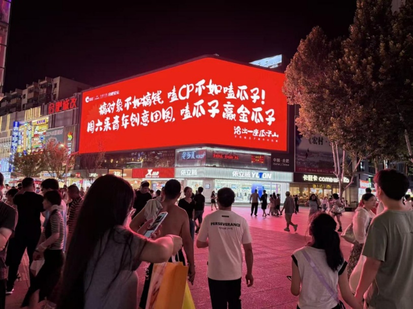 线上线下联动的“玩梗式预热”,让活动未办先火,精准触达年轻圈层。洽洽巧妙借势七夕节点,在合肥核心商圈投放创意大屏广告,文案直白又幽默:“招人!招大量七夕没人要的人”“嗑 CP 不如嗑瓜子”……用年轻人熟悉的“自嘲式玩梗”引发共鸣。这种预热方式,既传递出洽洽“快乐有趣”的品牌调性,又为线下赛事精准引流。