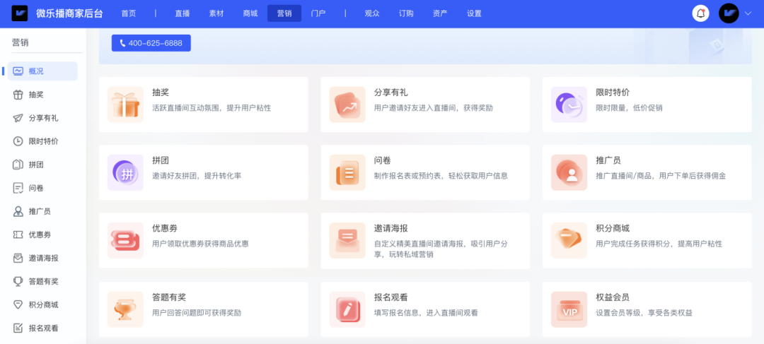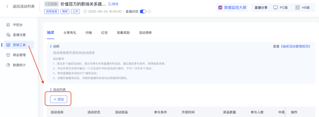 点击【营销工具】,可以添加抽奖、拼团、优惠券等营销活动,多种直播互动功能,能让你的直播更加精彩。