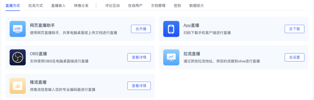 可以选择app直播、网页直播助手直播等多种直播方式,也可以获取推流地址开播。