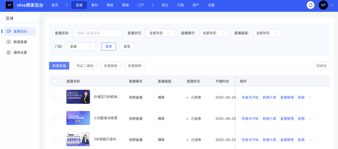 登录微乐播商家管理后台,点击【直播 - 直播活动】选项,然后点击左上角的 “新建直播” 按钮。