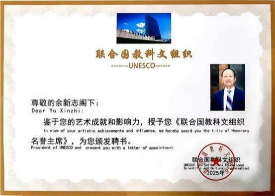 启功、李可染、欧阳中石、黄永玉、沈鹏被评为“艺术百年·新中国十大巅峰艺术家”。 同年 11 月 ,余新志被联合国教科文组织授予“联合国文艺宣传大使” ,并颁发了“大国荣誉金杯奖”2025 年 ,余新志又被联合国教科文组织聘为名誉主席 ,并颁发了聘书。
