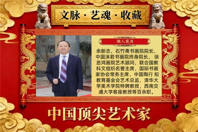 余新志,石竹斋书画院院长,中国沫若书画院终身院长, 徐悲鸿画院艺术顾问,联合国教科文组织名誉主席,国际书画家协会常务主席,中国陶行 知教育基金会艺术总监,清华大学美术学院特聘教授,西南交通大学客座教授等百余职。 1989 年就在中国美术馆成功举办个人书画展,声震画坛, 享誉海内外。2007 年应邀参加外蒙古国“纪念成吉思汗成 立 800 周年”大型活动,被授予“成吉思汗”荣誉勋章;2010 年被世界华人华侨总会评为“世界华人精英优秀人物”和“世 界华人杰出艺术家”;2011 年被国家授予“共和国杰出书画 家”勋章;2014 年被授予“全国‘五·一’劳模”勋章;2015 年被评为“非物质文化遗产传承人物”,授予“一代宗师” 荣誉称号。2017 年在美国洛杉矶举办画展,受邀走进联合 国会议大厅参加高峰论坛会,受到布鲁斯·罗茨主席的亲切 接并合影留念。2021 年余新志先生与张大千、林散之、李 苦禅、林凤眠、启功、李可染、欧阳中石、黄永玉、沈鹏等 顶尖级艺术家被评为“艺术百年·新中国十大巅峰艺术家”。 余老先生几十年来,走遍大江南北,全身心投入竹画写生创 作,收集素材数千幅,终于在 2012 年创作完成了长 103 米、宽 1.2 米的百米长卷《百竹雄魂图——万竿竹魂铸春 秋》,创下“画竹种类最多、最美的百米长卷”世界纪录, 传承千秋。2016 年百米长卷又被载入《中国国史》,为世 人留下了不朽的竹画史料、宝贵财富,永载史册。2024 年经国家艺术档案馆严格审评授予余新志为《中国四大国粹传 承人》,并颁发荣誉证书。2024 年 7 月授予《中国书画百 年巨匠传人》颁发荣誉锦旗、荣誉证书。从 1993 年以来, 中国邮政总局先后为余新志先生出版珍藏纪念邮票三十余 套,全球发行,传播文化。并先后出版发行余新志个人专著 画集数百套。上百幅作品被国家博物馆、中国美术馆等国内 外几百家艺术藏馆永久收藏陈列。其个人传略被载入《中国 人物年鉴》《中国国史》《中国历代美术家名人大辞典》《世 界人物辞海》等百余部辞书。余新志先生倾尽毕生心血,为 弘扬中华民族优秀的传统文化作出了杰出贡献。