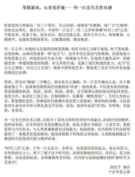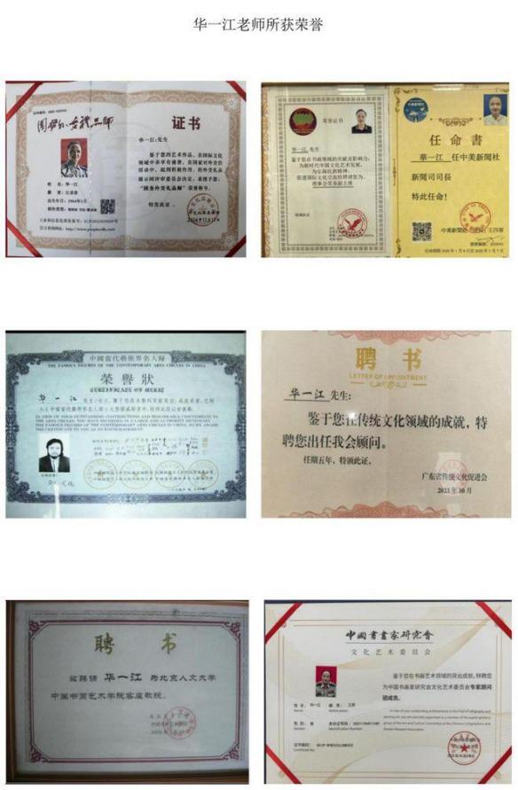 华一江 ,1964 年出生于江苏省无锡市红色革命家庭,宋代护驾宋高宗南渡 承事郎,华氏一世祖原泉公第 29 代世孙,在华氏十通五奇望族大统谱支脉中 , 为元代湖州刺史兼贡茶院总提领 ,即无锡华珪公奇二支卧云派后人。在其母系外祖母高祖是云贵川大都督 ,明代云南第一宰相杨一清的后人。1981年拜无锡市美术家协会副主席任昌龙老师为师 ,是徐悲鸿宗师第三代谪传弟子。 1984 年拜无锡市书画院王福元老师为入室弟子,是齐白石宗师第四代谪传弟子。字 :空渡 , 号:火神菩萨 ,笔名 :江南一江 ,中华一江 ,一品阁老 , 1984 届毕业于中国第一所书法艺术高校--无锡书法艺术专科学院 ,深造于南京艺术大学 ,世界第三大艺术圣殿-中国艺术研究院(中国画系)任学部委员 , 1999 年获世界书画大赛书画 双项金奖并在纽约成功举办个人书画展 ,2005 年由中国文化部调任中央军委在原迟浩田办公室为时任胡锦涛总书记专职书法陪练。2006 年应邀在中南海为温 家宝总理创作《锦绣江南》山水画 ,2008 年在国务院奥组委“2008 和谐中华迎奥运大型系列活动组织委员会” 出任执行主任,兼任奥运会全国书画大展评审委员会选评全国奥运书画金 ,银 ,铜奖的总评审并出席大型颁奖大典 , 同年出任中直机关中国长剑将军书画院院长