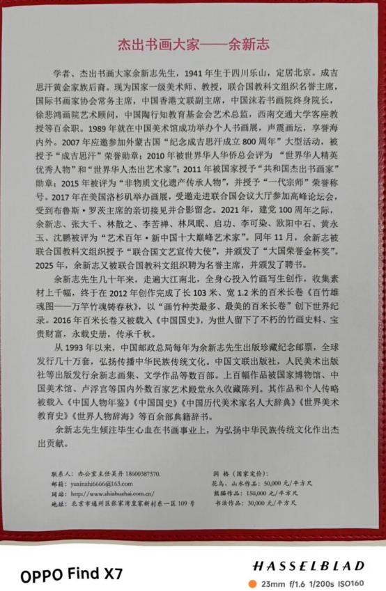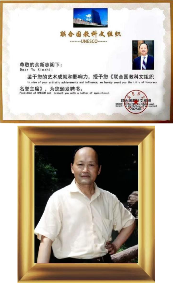 学者、杰出书画大家余新志先生 ,1941年生于四川乐山,定居北京。成吉思汗黄金家族后裔。现为国家一级美术师、教授 ,联合国教科文组织名誉主席 ,国际书画家协会常务主席 ,中国香港文联副主席 ,中国沫若书画院终身院长 ,徐悲鸿画院艺术顾问 ,中国陶行知教育基金会艺术总监 ,西南交通大学客座教授等百余职。1989 年就在中国美术馆成功举办个人书画展 ,声震画坛 ,享誉海内外。2007 年应邀参加外蒙古国“纪念成吉思汗成立 800 周年”大型活动 ,被授予“成吉思汗”荣誉勋章:2010 年被世界华人华侨总会评为“世界华人精英优秀人物”和“世界华人杰出艺术家”;2011 年被国家授予“共和国杰出书画家勋章:2015 年被评为“非物质文化遗产传承人物”,并授子“一代宗师”荣誉称号。2017 年在美国洛杉矶举办画展,受邀走进联合国会议大厅参加高峰论坛会受到布鲁斯·罗茨主席的亲切接见并合影留念。2021年,建党 100 周年之际,余新志、张大千、林散之、李苦禅、林凤眠、启功、李可染、欧阳中石、黄永玉、沈鹏被评为“艺术百年·新中国十大巅峰艺术家”。同年 11 月 ,余新志被联合国教科文组织授予“联合国文艺宣传大使”,并颁发了“大国荣誉金杯奖”2025 年,余新志又被联合国教科文组织聘为名誉主席,并颁发了聘书。