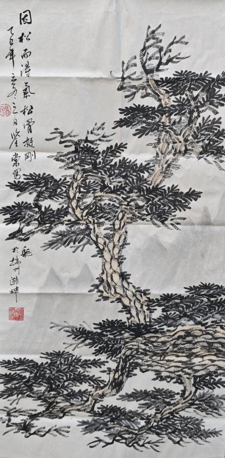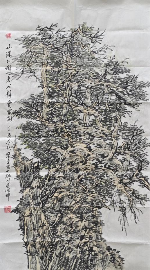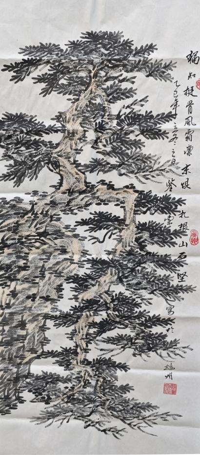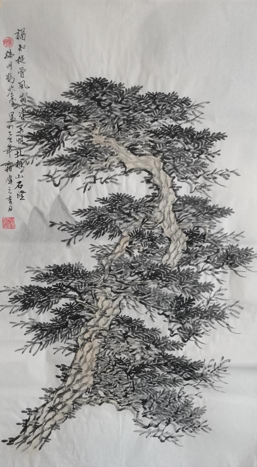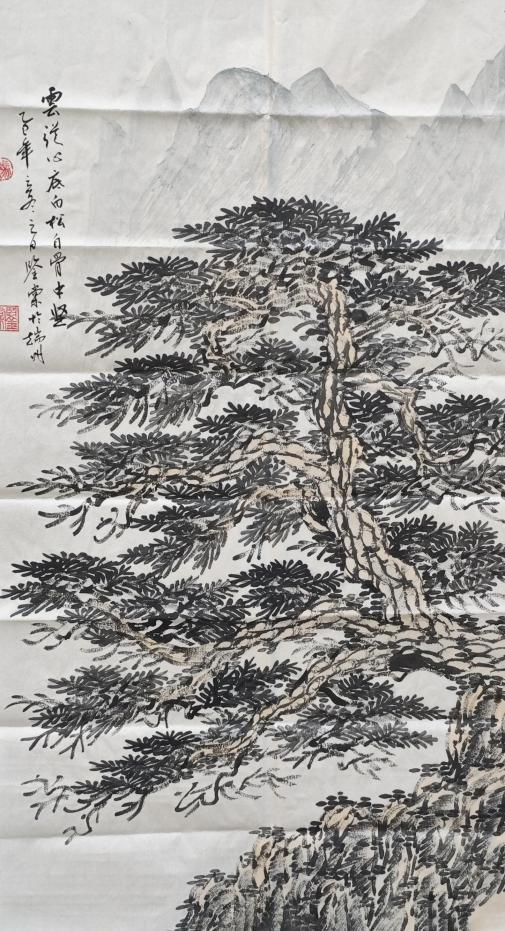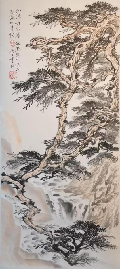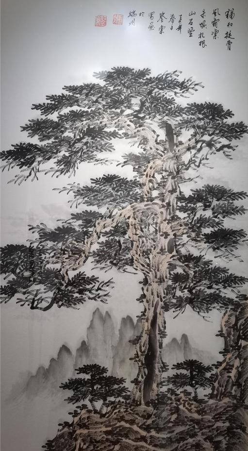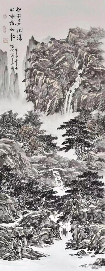 特别值得一提的是,在松树的笔墨墨上,他从古典之法入手,又参意当代造型的立体感,枝如虬龙蜿蜒,叶如铁针勃勃,使得画中的坡松皆有浓密茂盛的气质韵味,又不乏凤尾梢卷之势,缜丽丰润,苍翠华滋,这种独有法度的松韵塑造,是其山水多有芊绵意象的支撑,法不欺人,功不欺世!