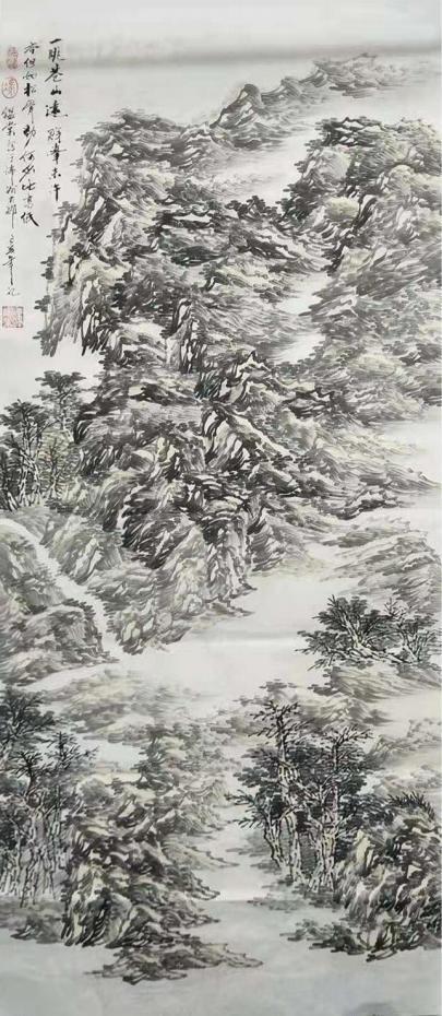 山中一夜氤氲雨,树杪松木百重瀑。当今的山水,范式作品太多,临画唯以粉本为上,这是山水缺少性灵的原因。先生作山水,知范式得不拘于范式,创作的主动性特别强,游览真山真水,把真实的视觉经验提炼成山水的文化气韵,写意重峦迭翠万壑争流,表现云蒸霞蔚草木蒙茸,自然是举重若轻,驾轻就熟。山映斜阳天接水,雅俗共赏大手笔!