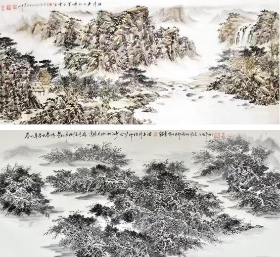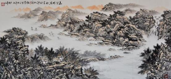 纵览先生的山水作品,把三远之法调节的相当和谐,高远山势耸立,上突危峰,下览深谷,云山共高下。平远随深远,近处松杉崖岩相衬,令人心摇目断,神追三山之巅。远山云雾氤氲,虚实相映。空间层次丰富,可以心泊其间,忘我畅神。溪水潺潺,扬气腾波,重山复岭,气势嵯峨!从先生的山水画中,可以看出他对山水的南北两宗的兼收并蓄,博观约取已经摆脱了流派的束缚,走上了师造化悟真诀的境界!