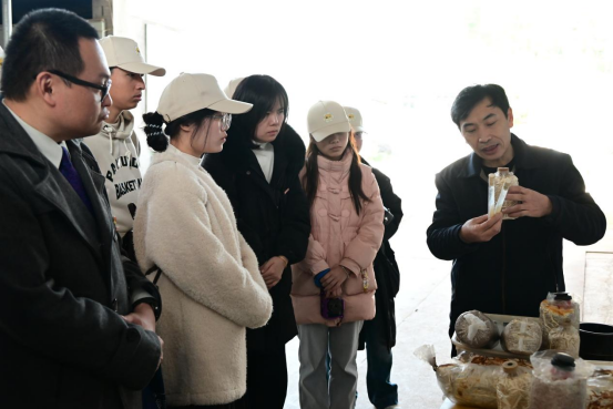 活动过程中,负责人董贵发详细回顾了公司的发展历程:自1995年以茶树菇培育为起点,逐步深耕细作,凭借金针菇成功打响品牌;2017年,公司顺势转型,拓展培育滑菇、灵芝等特色菌类品种,推动菌类作物实现多元化发展,展现出广阔的产业前景。师生们在现场认真学习了完整的菌种培育工艺,系统掌握母种、原种、栽培的全流程技术,重点研习了莲子壳生料栽培平菇、龙爪菇工艺改良等特色技术,并近距离观察滑菇、灵芝盆景的培育全过程,深入了解到菌丝体皮革、灵芝下脚料饲料等前沿研发项目。