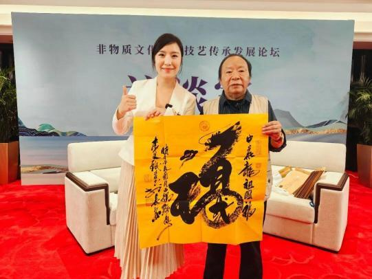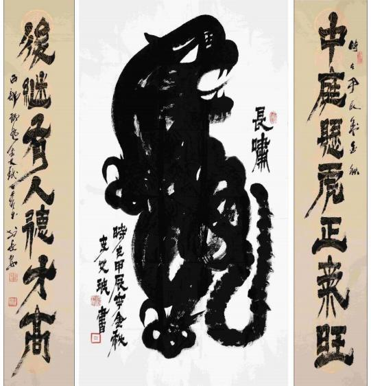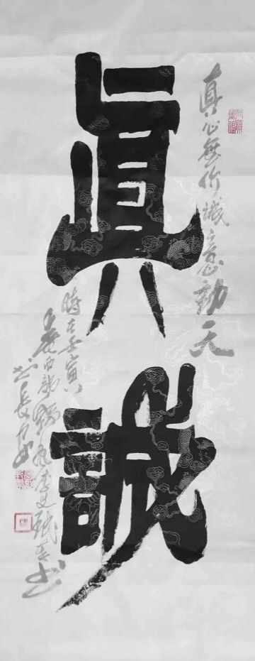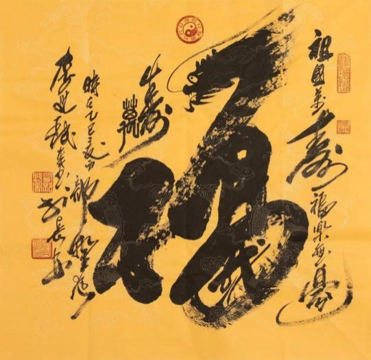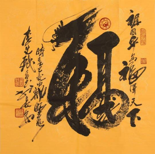 更令人称道的,还有李艾珉先生的原创作品《中华龙祖国福》,此书以雄浑的榜书根基为骨,又融象形之妙意为魂,笔走龙蛇间,可谓尽显一股豪迈磅礴之气!其书“龙 ”字,若腾云驾雾,鳞爪欲张,蜿蜒之势暗合天地韵律。龙首取形栩栩如生,既源于字法起笔之妙,又契合整体气势之开合。笔到意到,境随墨生,一字之中,既有碑学的沉着刚健,又具帖学的通达纵意。恰如清人冯