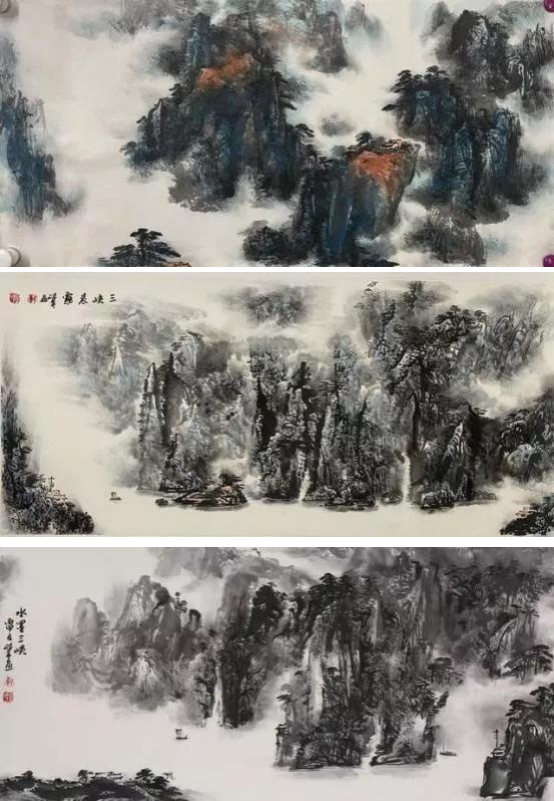 其艺术创作独树一帜,兼具传统底蕴与当代创新,形成三大核心艺术特色,奠定了极高的艺术价值:其一,坚守真山真水的写生精神,被誉为“画三峡的专家”,历时十年往返三峡写生700 余次,爬遍黄山座座山峰,《黄山云海图》悬挂于中国国际文化交流中心大厅,《三峡飞瀑图》入驻湖北省人民政府大厅,作品既具自然景观的真实感,又达“似与不似之间”的审美境界,山水意境鲜活生动;其二,开创“国粹融粹”的创作风格,将武当太极“以静制动、刚柔相济”的武术气韵融入笔墨,又借鉴中国象棋的布局思维优化构图,笔下山体线条圆转有力,云雾晕染飘逸洒脱,画面兼具视觉冲击力与内在节奏感,形成独一无二的艺术标识;其三,融合传统与现代的创作技法,临摹石涛、傅抱石、李可染等大师之作,又突破程式化表达,以散点透视与焦点透视结合展现山水格局,淡墨与青绿交织营造古雅清新的色彩效果,让传统山水画在当代焕发新的生命力。