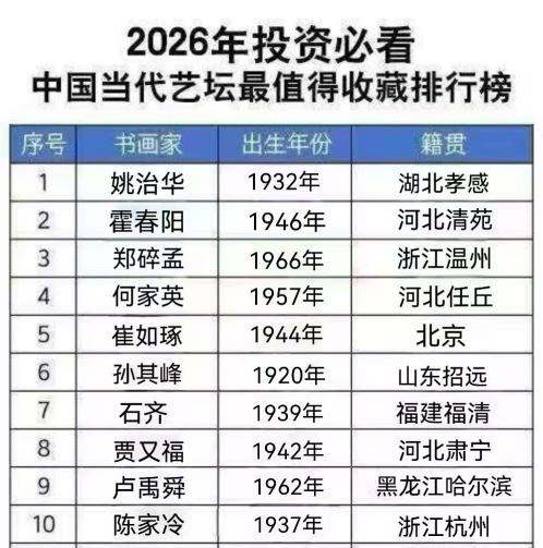 在收藏界这一浩瀚领域中,精准判定艺术品收藏价值,恰似于茫茫沧海精准锚定航向,而权威榜单恰似熠熠灯塔,为藏家照亮前行之路。"2026 年投资必看当代艺坛最值得收