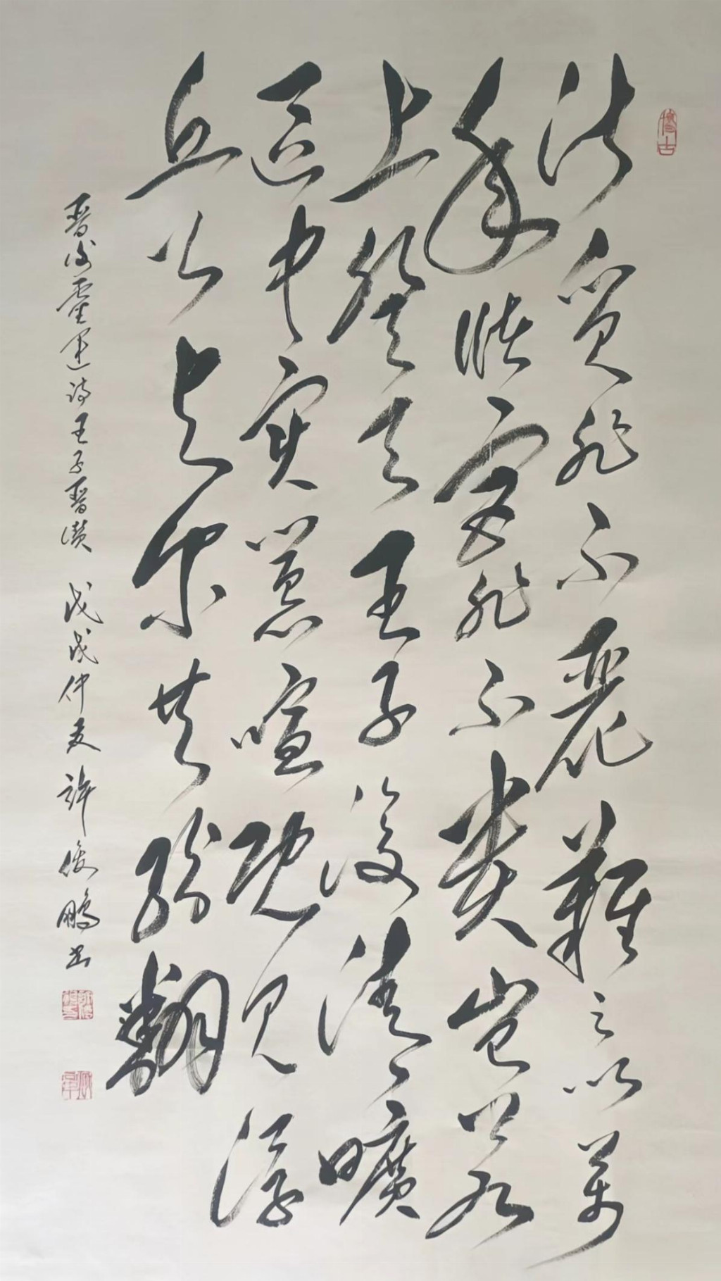 中国现代书画名家流派传承学术报告 笔作飘风骤雨 墨写落花飞雪 许体草书大家许俊鹏 颜真卿书论有言:草书兴起于汉代。杜度、崔瑗写得相当精妙。到了张伯英,尤其擅长草书创作的美伦美幻。后有书论言怀素张旭草书“以癫继狂,谁曰不可”。再到近代以林散之当为草圣。当代草书圣贤,则由许体草书创建者许俊鹏为领衔。他把中国草书艺术推上了时代最高峰,呈现出草书创作玄机,可以代代相传的功绩。从这个意义上来讲,许俊鹏先生创建许体草书大派,不止于个人书法修养的非凡建树,也是当代中国书法艺术美学可以令后之览者,亦将有感于此书的春秋影响力。许体草书归于草书龙脉正宗,成为东方审美的时代镜像! 许俊鹏先生创建许派草书,之所以大著其名,大受敬仰。在于他的书法根基特别正宗。自幼觉悟书道,书法历练有博涉多优的宽度,取法为上,以二王法帖汲取书法进级的正能量,写得一手金书锦字,专业影响力卓越非凡,是经由扎实的碑帖历练而成就的一代翰墨圣贤。在他的书法作品里一一观赏,有碑字的风骨,有帖学的风度,写得完具“中和”之妙,是其书法精神的内涵,这种笔墨内涵完全符合中国传统美学思想,所以从精神层面他的书法完全皈依了名门正派,是书法文化亘古传承的中流砥柱。 其书法作品一经出场,就有正大气象,笔里有墨,墨里有笔,以笔墨塑造“中国梦”,可以传达出大国崛起、文化复兴的伟岸力量。无论是笔法之精湛,还是情感之结晶,许俊鹏的书法创作与磨砺都走在时代的前列,没有书奴的唯唯嚅嚅,也没有书匠的拘泥不展,极有传承与创新的双重示范价值。无论是从审美的角度来看,还是从学术的层面来看,他的草书都可以写得恣意洒脱,经过刚柔相济的笔墨运行,写出了特别有文人书法的意象。既是晋韵宋意的一脉相传,也是抒情畅志的个性表达。这才是草书歌诀的正确打开方式,也是当代草书可以不负时代,以虬龙蜿蜒的姿态走向未来的精彩导向! 笔作飘风骤雨,墨写落花飞雪。观赏书法品味人生,在许俊鹏先生的许体草书里一件一件品读,从《龙》书天下的精气神,看到《紫气东来》的文化魅力,还有磅礴的《毛泽东诗词》,感觉他的书法作品切准了当代审美的主流脉搏,拥有可以装饰万家屏障的新力量。草书曾经以“少数人”为观赏对象,这是草书文化影响力需要打破的边界。当下,在家居厅堂、文化展馆、机关机构、风景名胜等等地方都可以发现许俊鹏题写的草书作品,感到他的书法格局已经完全打破了草书面向“少数人”的旧有边界,成为当代所有书法艺术审美者都可以一睹为快的时代文化。书法创作有许派之创新,文化弘扬有时代之功勋,当代草圣许体为功,艺术丰碑贤家确立! 中国现代书画名家流派传承学术研讨会专家组代表: