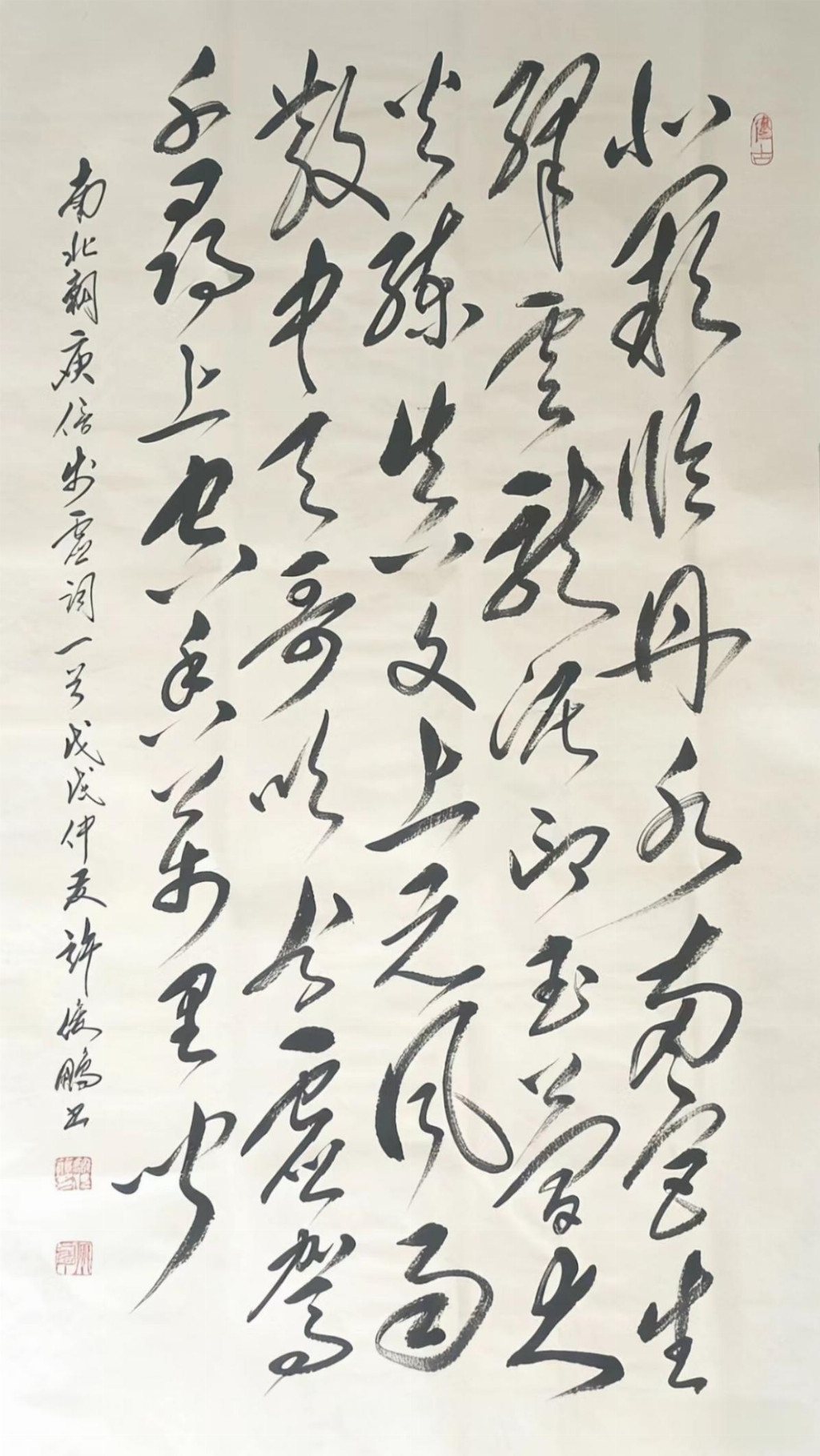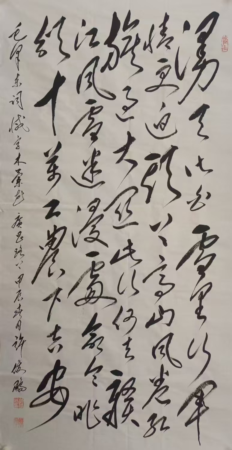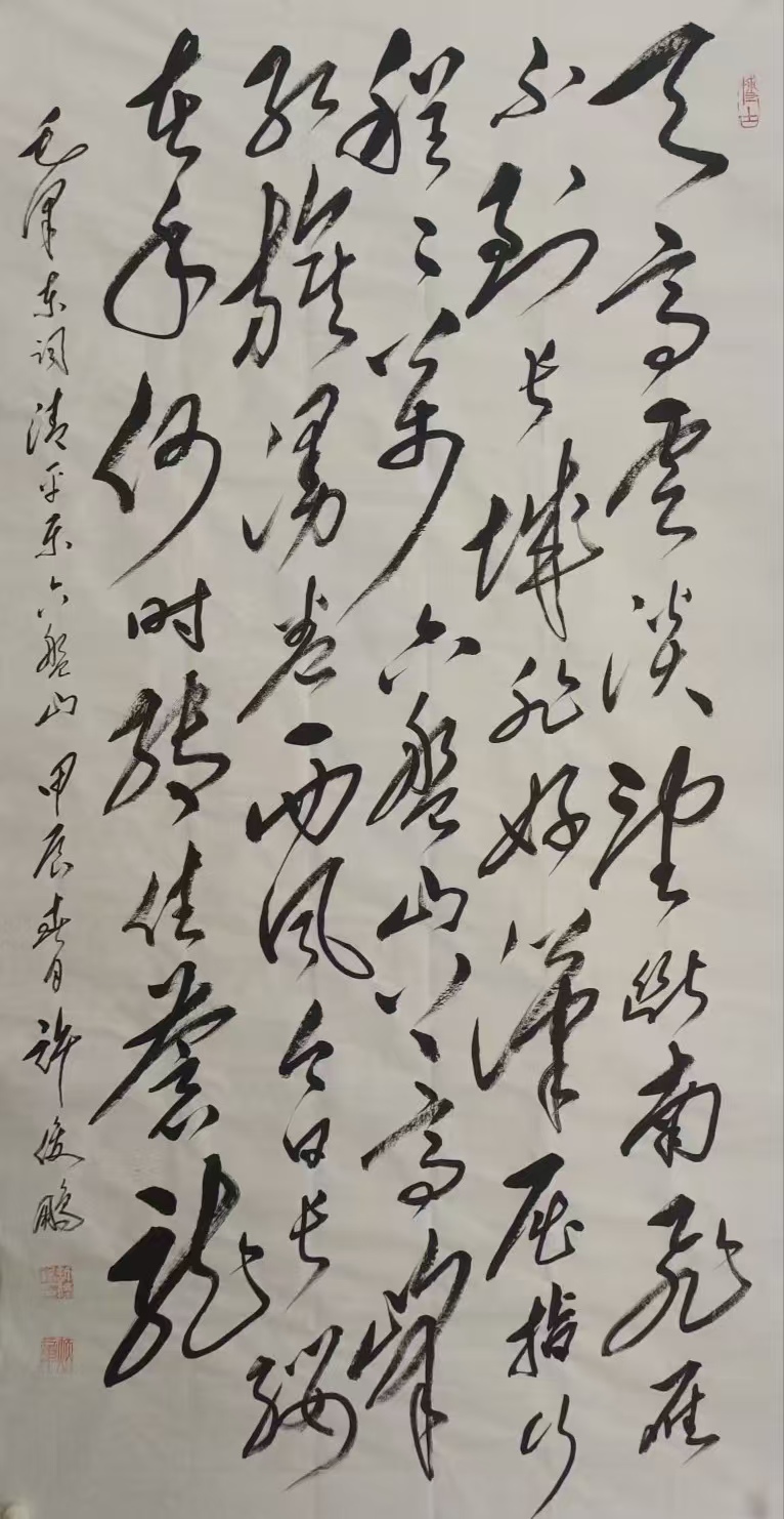近六十年来,许俊鹏潜心钻研,先入于楷书,他以王羲之、颜真卿、欧阳询、褚逐良、柳公权等历代书法家字帖为师,无论是雄强伟岸的大楷、厚重高古的小楷,还是法度严谨的中楷,皆得神会,他继承了颜真卿楷书的雄强与朴厚,欧阳询楷书的严谨与气度,褚逐良楷书的灵动与变化,集诸家的长;行草书博采“张旭、怀素”之神采,集“王铎、傅山”之意韵,熔众法于一身, 面貌凸显,特别是在“毛体书法”中,心追手摩、孜孜以求,不断磨砺,终融一家之言,“毛体书法”在其笔下如出化境,结字上把“毛体书法”的气势发挥到了极致,以遒劲笔法改变字形,再以中锋强力运笔,轻重对比强烈,真正有神龙飞腾之感。行草书《赤壁怀古》线条如空中的细柳摇曳飞舞,行笔刚毅,元气充盈,动静自如,以平面几何关系布局章法,在平面视觉空间构筑上注入自己独特的美学原理,强烈的对比,让观众在视觉上犹如“开天辟地、飞沙走石”之势,书法效果力图强调艺术精神与人格历练对书法风格的审美趋向;《毛泽东二首》柔中有刚、刚柔相济;方中有圆、寓圆于方;正斜互依、藏动于静;对立与和谐、节奏中赋予韵律,奔放而不失法度、潇洒而不失真切、险峻而不失庄重,强烈的视觉冲击力让人耳目一新,过目难忘。纵观许俊鹏书法体势严谨、丰腴雍容,浑然天成;章法气势如虹、纵横跌宕;笔墨酣畅淋漓、潇洒自如;用笔含蓄多变、遒劲恣肆,独特的艺术风格成就非凡的艺术人生。