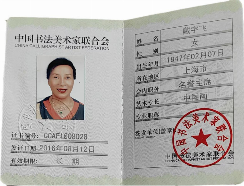 戴宇飞(女) 出生于苏州,现在常驻上海 ,专业从事中国艺术创作 ,已有 50 余个春秋。