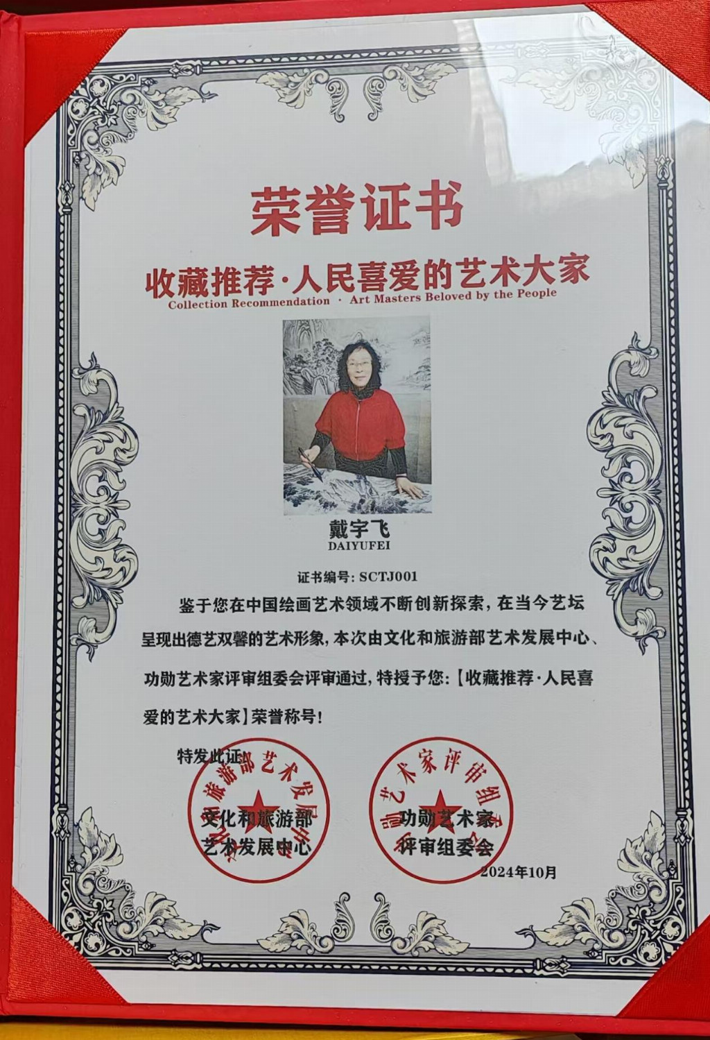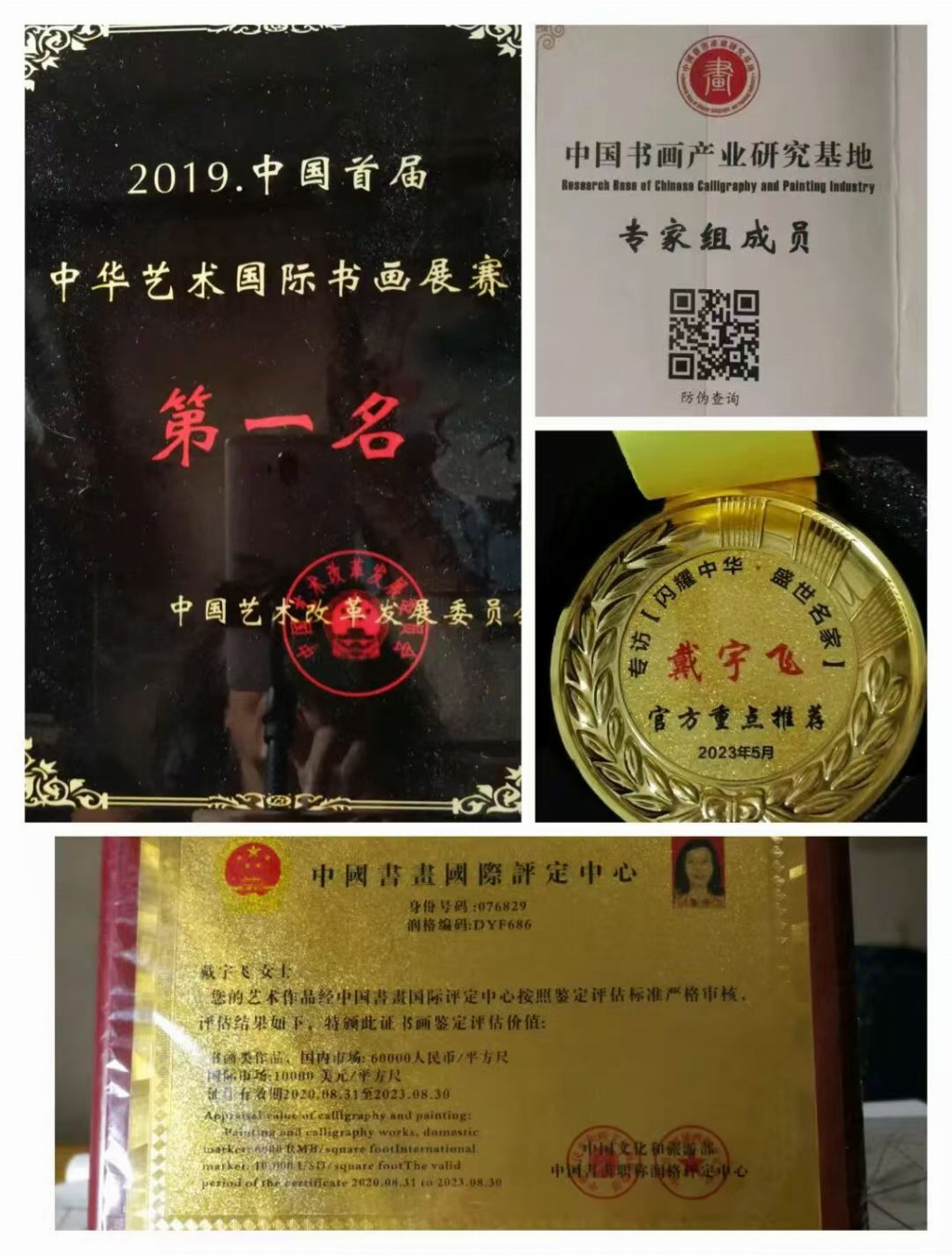 2017 年 6 月由中国文学艺术界联合会、 中美协、 中书法协会颁发的资质证书:文化艺术专业职称级别为“ 中华当代杰出艺术家”。她的简文在《上海现代书画名家名录》上第四次再版登录。作品在《海内外获奖作品精品选集》等大集出版。她的作品在港澳地区展出颇受海内外人士的青睐。