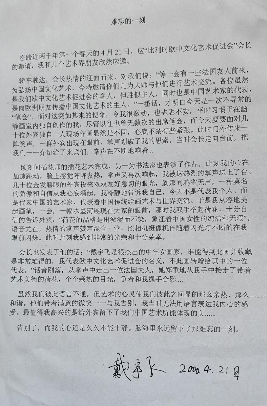 戴宇飞多次举办个人画展 ,参加各类国家级大型展出 , 2011 年 12 月 她应邀参加了全国书画名家名作走进丹阳精品展,她的作品《四大美女》获得优秀奖。 2017 年初被有关部门推荐人选 ,戴宇飞代表中国出席参 加“ 中俄美国际艺术大师三人行”书画展作品集,作品由中国美术文化 出版社出版。 2017 年 7 月她受邀出席参加上海艺术中心“爱我中华- 世界华人艺术家书画作品邀请展”暨纪念中国人民解放军建军 90 周年 大型书画展 ,同期作品由天津人民美术出版社出版。历年来她的作品曾在上海市文汇报、新民晚报、侨报等各大报纸刊登 ,作品《竹林七贤》在第二届“世界华人书画大赛”中荣获“ 国际金奖”;作品“姑苏水乡”在澳大利亚悉尼中国画研究会举办的“首届亚太地区中国水墨画雪梨金奖大赛”上获大奖并予以收藏;《燕归人未归》、《西施浣纱》等作品 均获大奖。 2000 年 4 月21 日戴宇飞应邀出席比利时欧中文化艺术促 进会向几十位法国贵宾现场作画 ,赢得全场雷鸣般掌声。 2017 年在哈 萨克斯坦世博会荣获中国山水画艺术光明之路金奖。在首届 2019 中国 北京“ 中华艺术国际书画展赛”中,作品“黄山朝雾”获得美术艺术专 业第一名。 2024 年获得中国书画艺术创作金奖 , 同年获得 CCTV 编辑 部特别推荐 2024 年度杰出艺术人物。 2025 年 4 月荣获诺贝尔国际文 化奖。