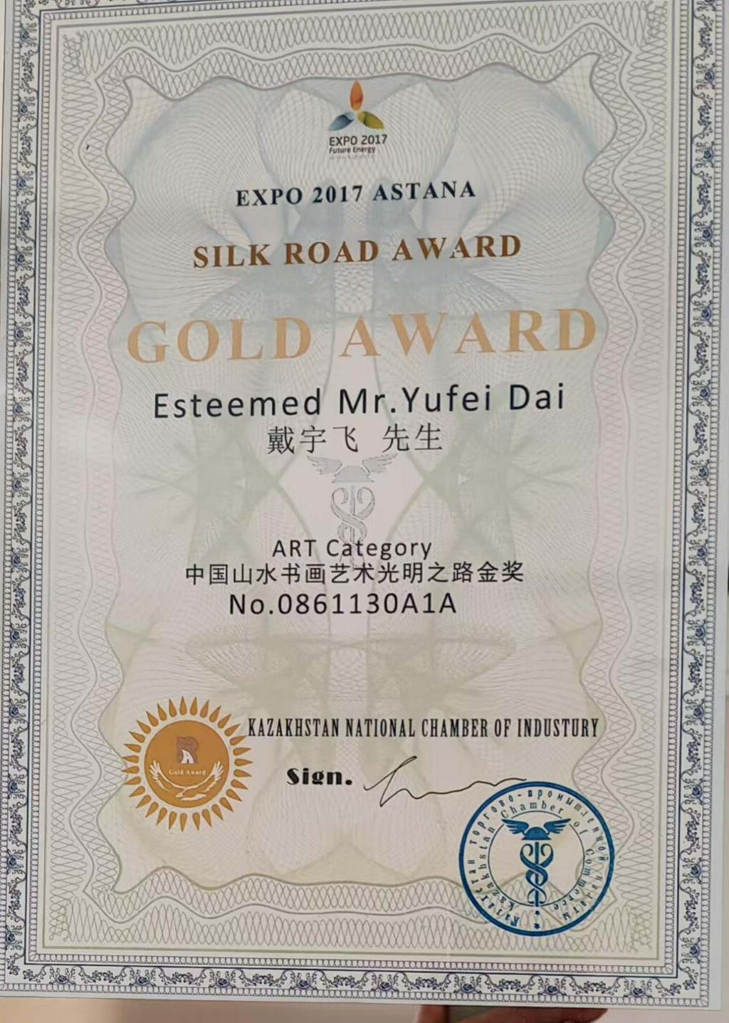 2017年在哈萨克斯坦世博会上获得中国山水金艺术金奖