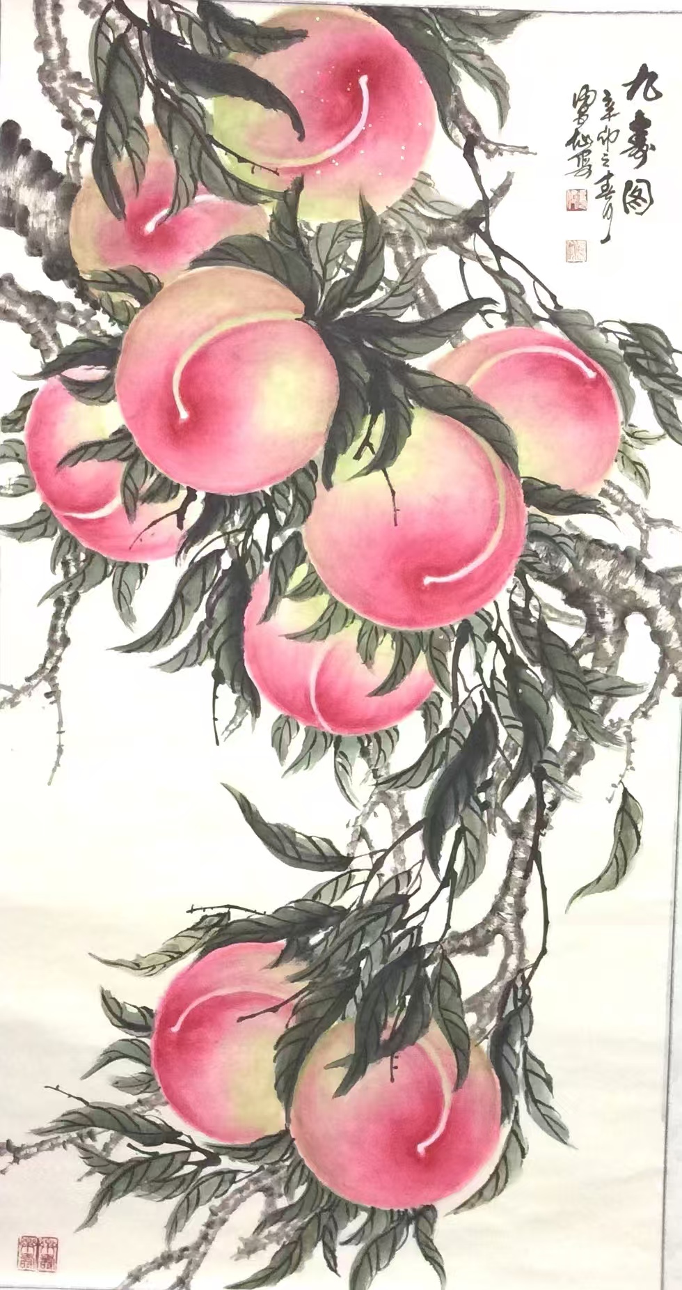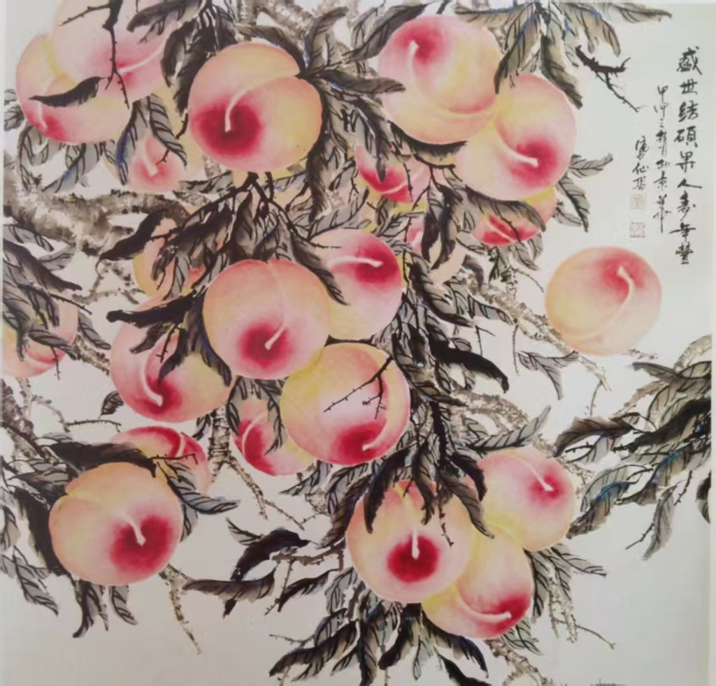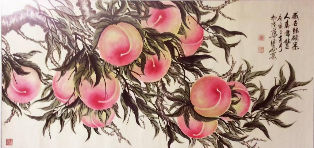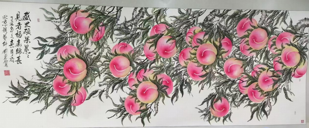 刘凤仙创作,意存笔先,画尽意在,豪放不显张扬,意境深远而不失恬淡清新,其梅花或艳如朝霞或白似瑞雪;寿桃或娇艳欲滴或灵秀芬芳,阵阵暗香仿佛跃出纸面,扑面而来,巧妙的将自然灵性点染画中,好似呼唤出了中国千年文化底蕴的深沉回声,诠释了中华民族古老艺术的深刻内涵。
