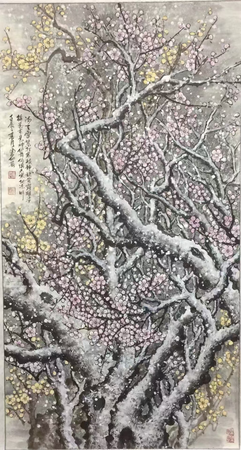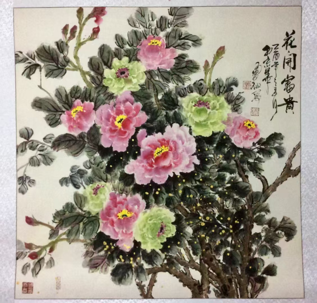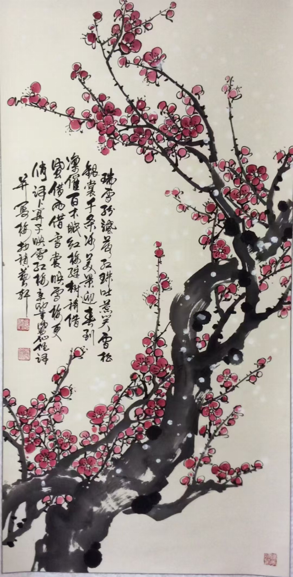 刘凤仙创作,意存笔先,画尽意在,豪放不显张扬,意境深远而不失恬淡清新,其梅花或艳如朝霞或白似瑞雪;寿桃或娇艳欲滴或灵秀芬芳,阵阵暗香仿佛跃出纸面,扑面而来,巧妙的将自然灵性点染画中,好似呼唤出了中国千年文化底蕴的深沉回声,诠释了中华民族古老艺术的深刻内涵。