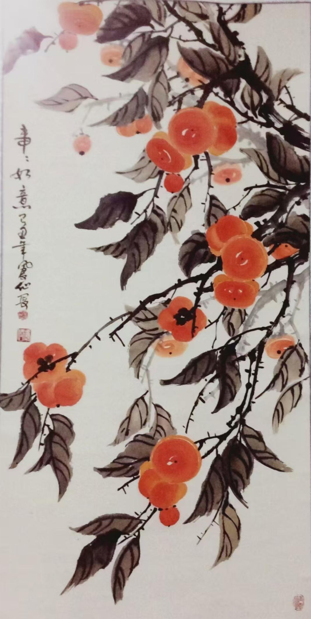 绘画作品中的诗文跋语往往代表作品主人的心声。一句好诗,能表现出作者的内涵和学养。一句好诗,亦能起到画龙点睛的作用。刘凤仙作品中的诗句布局巧妙,胸怀天地,在构图上,突出主体,讲求布局中的虚实对比与顾盼呼应,把发挥画意的诗歌题句,用与画风相协调的书法在适当的位置书写出来,辅以印章,成为一种以画为主的综合性书画艺术作品,留白空间的疏、密、聚、散;花、果、鸟、叶的柔嫩灵活,