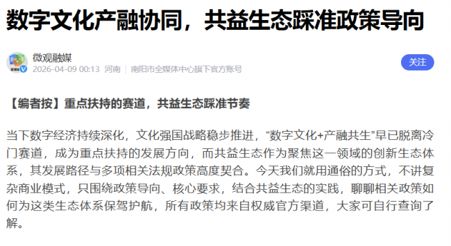 媒体关注,既是对相关政策解读专业性的认可,也是对共益生态政策适配性的肯定。这些行业法规从来都不是“纸上谈兵”,而是国家战略的具体落地,给数字文化、产融协同领域提供了可操作、有针对性的指引。共益生态的实践充分证明,只要跟着政策走,立足数字文化和产融协同核心,构建符合规范、贴合行业需求的生态,就能获得行业支持,实现生态发展与行业进步同频共振。未来,随着政策的持续深化,共益生态也将继续践行政策导向,在数字文化与产融协同的赛道上稳步前行,为行业高质量发展注入新活力。