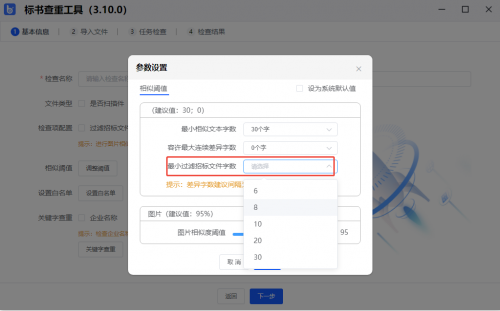 关键字查重:自动检测标书内企业名称、手机号、身份证号、邮箱号等核心关键字,支持自定义关键字库,可快速定位因关键字雷同导致的投标风险,同时支持扫描件中“信用中国”内容单独屏蔽,避免因公司名称不同、其余内容一致导致的无效异常。