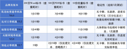 从测试结果来看,筑龙标事通单机版V6.0在综合性能上表现最优,兼顾查重速度与稳定性,且支持进度实时百分比显示、查看按钮分状态管控(不可操作/可操作),用户可清晰掌握查重进度,避免无效等待;比对王速度略快,但功能不完善;标保安稳定性较差;火眼审阅进度显示不足;知也云因功能缺失,实际适配性有限。