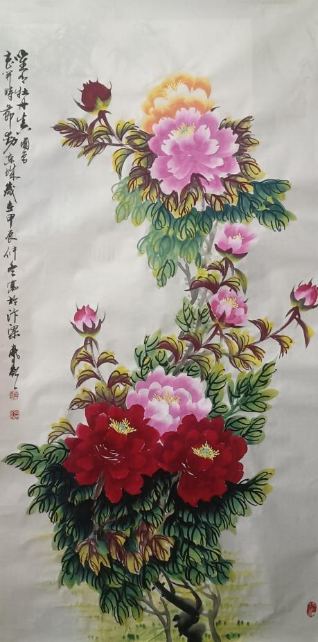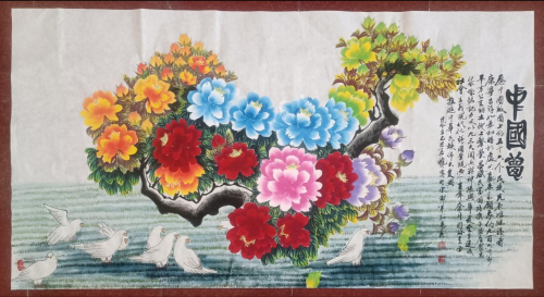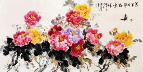 冉凤岭先生的牡丹主题创作,以其大气富贵,寓意中华腾飞的主旨脱颖而出,不仅形神兼备,而且富有深刻的文化内涵,展现出深厚的绘画功底与对传统文化的理解。在构图上冉善于运用大空间进行大创作,大处落笔小心收拾,使得画面既不失大气磅礴之感,又能细致入微地刻画每一朵花瓣的纹理与质感,让作品凝聚峥嵘如铁的力量。色彩巧妙地处理浓淡干湿的关系,对比与和谐,生机盎然,在画里画外又不失宁静雅致的主题氛围。他的牡丹画作不仅仅停留在视觉美感层面,而是通过牡丹寓意传达超脱于物象之外家国图腾,让人在欣赏之余不禁沉醉“国色天香溢中华”的精神氛围中,感受大国崛起的进程。因此,无论是从技法的角度还是从艺术表达的高度来看,冉凤岭先生的牡丹作品都是当代中国画体系中不可多得的佳作。
