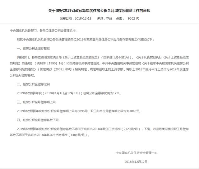 就在2018年12月13日,中央国家机关住房资金管理中心发布了关于做好2019财政预算年度住房公积金月缴存额调整工作的通知。通知内容如下: