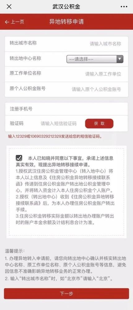 6、填写转移信息;(一定要确保信息准确信)转出城市名称、转出地中心z名称、原工作单位名称、原公积金账号,注册手机号,验证码